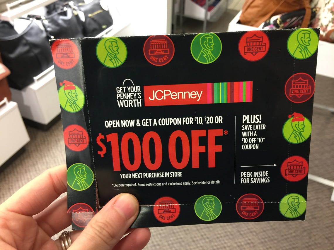 JCPenney Black Friday Coupon Giveaway $500, $100 or $10 off Purchase on ... JCPenney will be giving away $500 off $500, $100 off $100 or $10 off $10 coupons on Thursday November 22nd! Doors open at 2PM. Each offer good in store only. $10 off $10 valid 11/22/18 -11/23/18. $100 off $100 and $500 off $500 valid 11/22/18 -12/24/18. 1 in 100 coupons is $100 off $100, 99 in 100 coupons are $10 off $10.