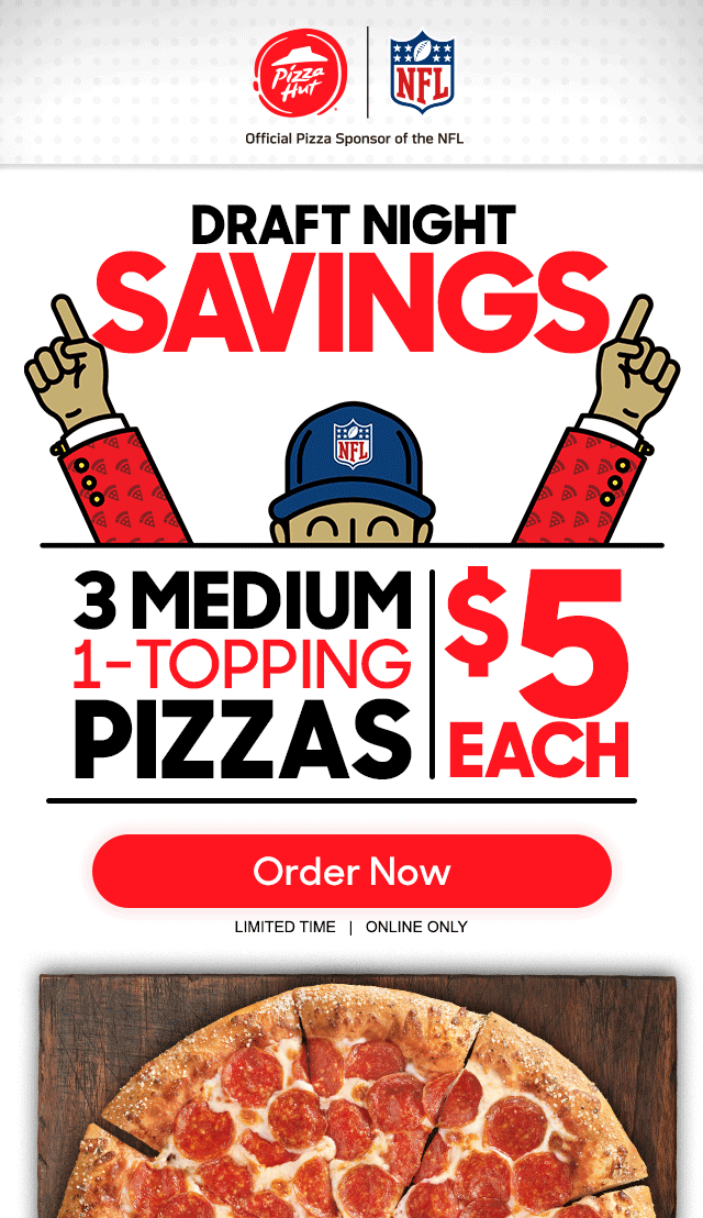 Pizza Hut: 50% off all menu-priced pizzas through Saturday - WRAL Apr 23, 2019 ... In celebration of the 2019 NFL Draft, score 50% off all menu-priced Pizza Hut pizzas when you order online with the coupon code through ... Pizza Hut Coupons - $10 OFF in October 2022 Score $10 Off $20+ with Pizza Hut Coupon Code · Order Pizza and Save 50% on Select Items with Pizza Hut Coupon · Pizza for 15% Off Using Pizza Hut Promo Code · Get ... Pizza Hut on Twitter: "@mannyjalapeno Place your order online ... Place your order online today and you will receive an email tomorrow with your NFL Shop discount code! Please let us know if you have any further questions!