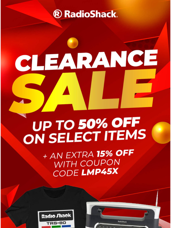 RadioShack Coupons, Promo Codes 2022 - RetailMeNot.com RadioShack Coupons & Promo Codes Submit a Coupon Save with 6 RadioShack Offers. FREE SHIPPING Sale Free Shipping on Orders of $30+ See Details $15 OFF Code $15 Off $100+ Added by ChaChinging Show Coupon Code See Details 10% OFF Sale 10% Off Order With Email & Texts Signup See Details FREE SHIPPING Sale Free Shipping on Orders Over $35 See Details